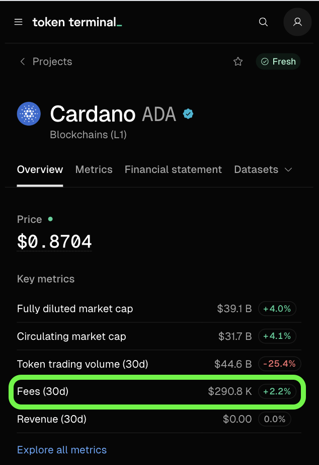 Another source suggest ADA make $300K a month in fees, which is very low and they rank at about #100 of all crypto projects.